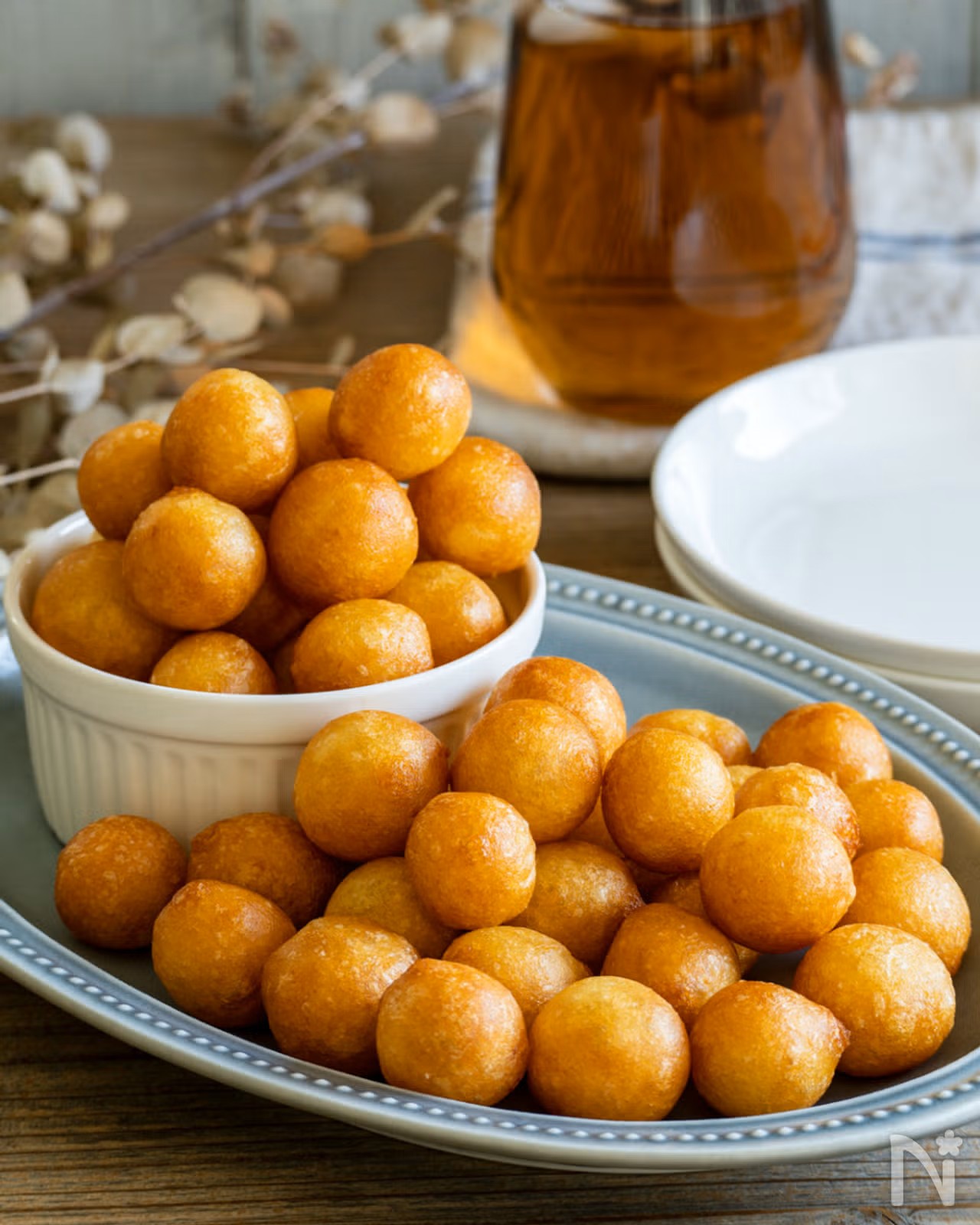 外はこんがり、中はもちっとした食感が楽しいおさつボール。白玉粉を加えることで生まれる弾力がクセになり、ひと口サイズでつい手が伸びます。そのままでも美味しく味わえますが、練乳をかければ一気にスイーツ感がアップします。
