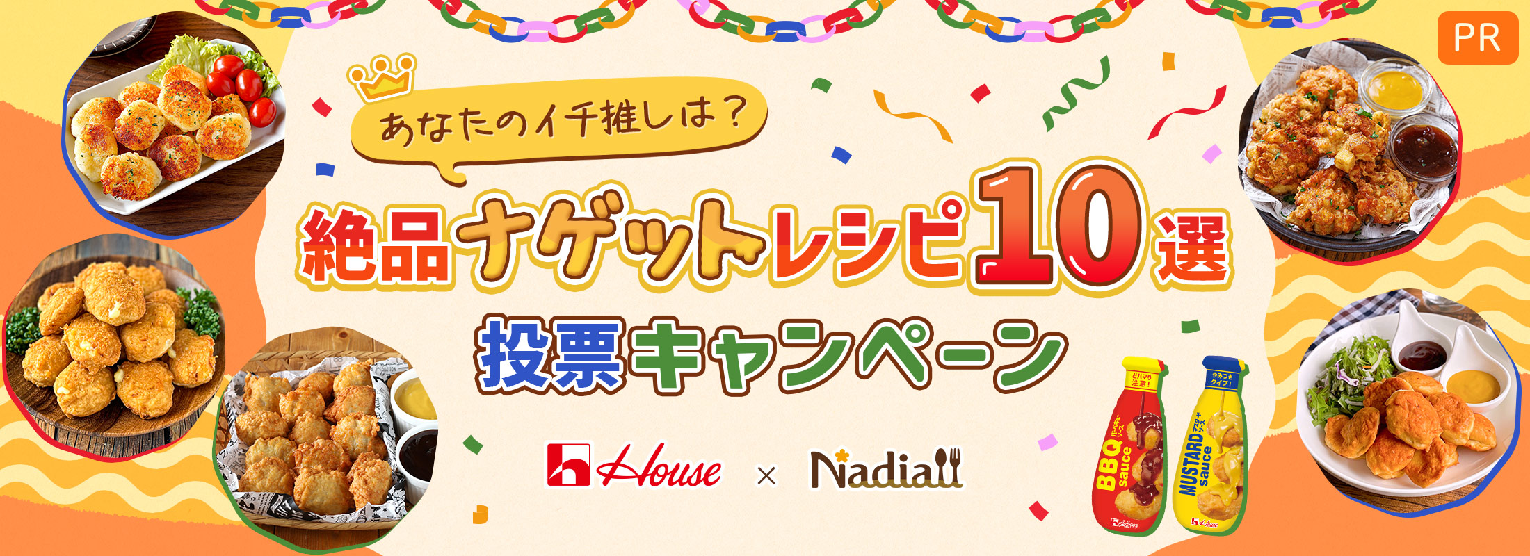 Nadia株式会社(東京都港区/代表取締役社長 葛城嘉紀 以下「Nadia」)とハウス食品株式会社(東京都千代田区/代表取締役社長 川崎 浩太郎 以下「ハウス食品株式会社」)がタイアップし、特設企画ページ【あなたのイチ推しは?絶品ナゲットレシピ 10選投票キャンペーン】を公開いたしました。
