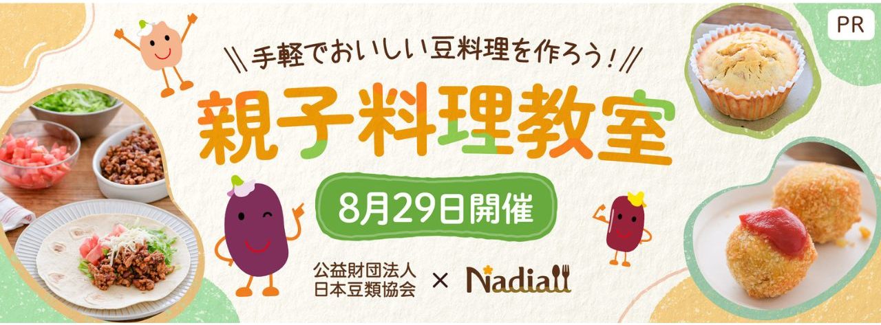 Nadia株式会社(東京都港区/代表取締役社長 葛城嘉紀 以下「Nadia」)と公益財団法人 日本豆類協会(東京都千代田区/理事長 篠原末治 以下「日本豆類協会」)がタイアップし、豆類を使用したレシピを体験する親子料理教室を開催いたします。