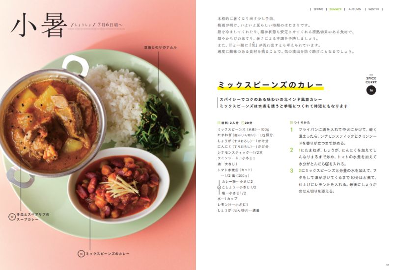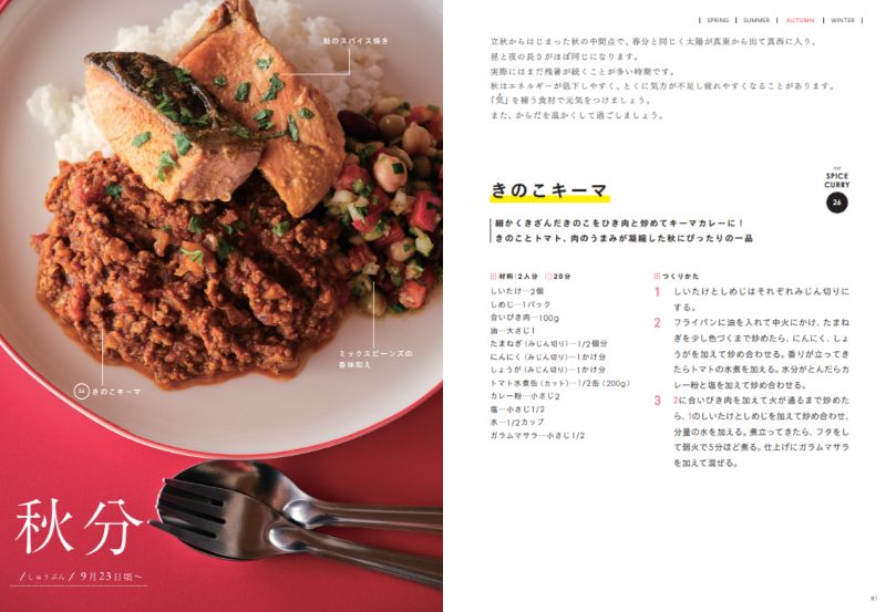 季節の変わり目に感じやすい「なんとなく不調」を、毎日のご飯で優しく整えていこうという思いから生まれたのがこのレシピ本。春・夏・秋・冬、それぞれの時期に合わせて提案されたスパイスカレーと副菜が、1年を通して24種類紹介されています。季節に合ったものを、その時期に取り入れていくことで、無理なく“食べる養生”が続けられます。