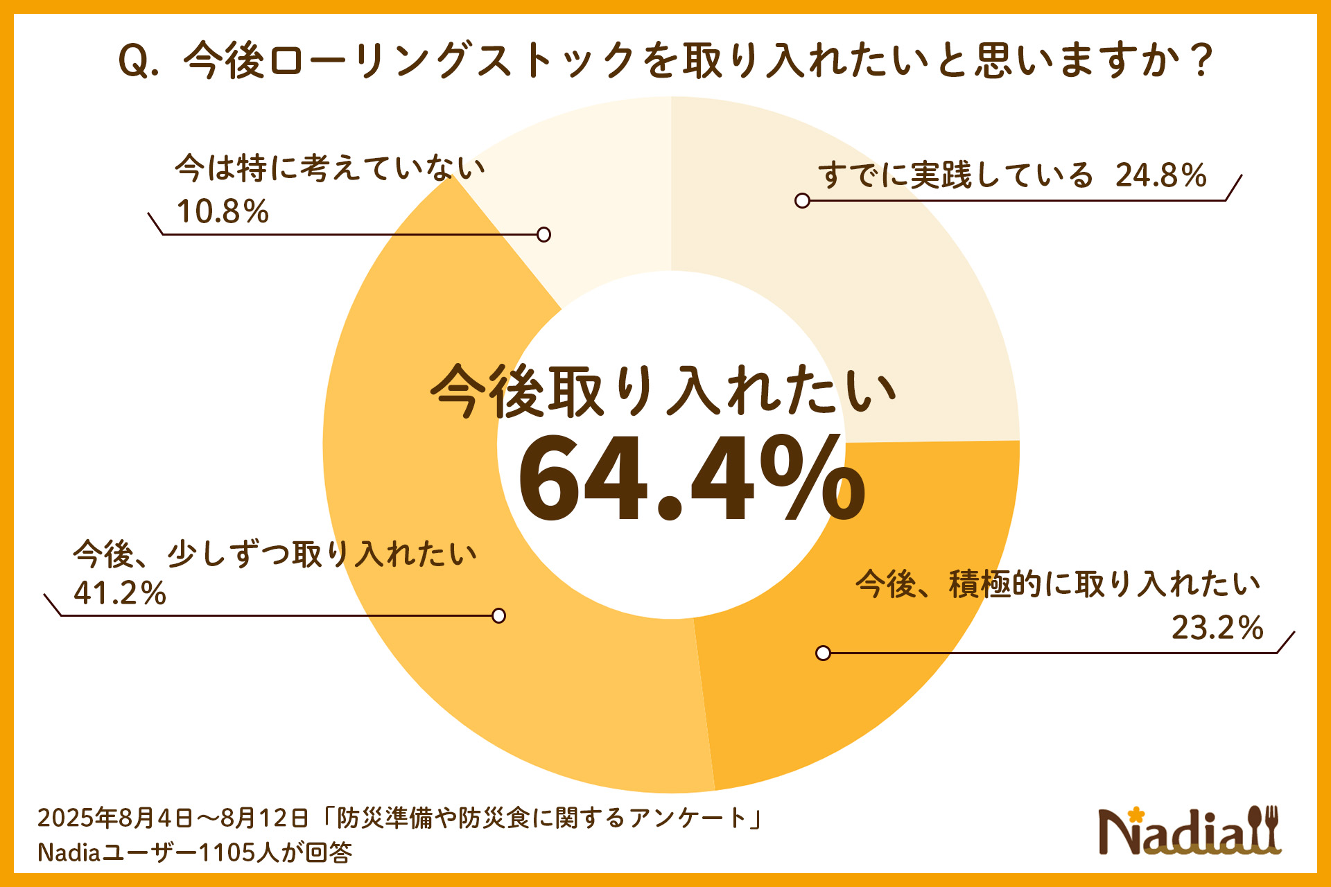 また、ローリングストックについて「今後、積極的に取り入れたい」「今後、少しずつ取り入れたい」という声は合わせて64.4%にのぼり、「すでに実践している」の24.8%も含めると、ローリングストックに高い関心が集まっていることがわかります。