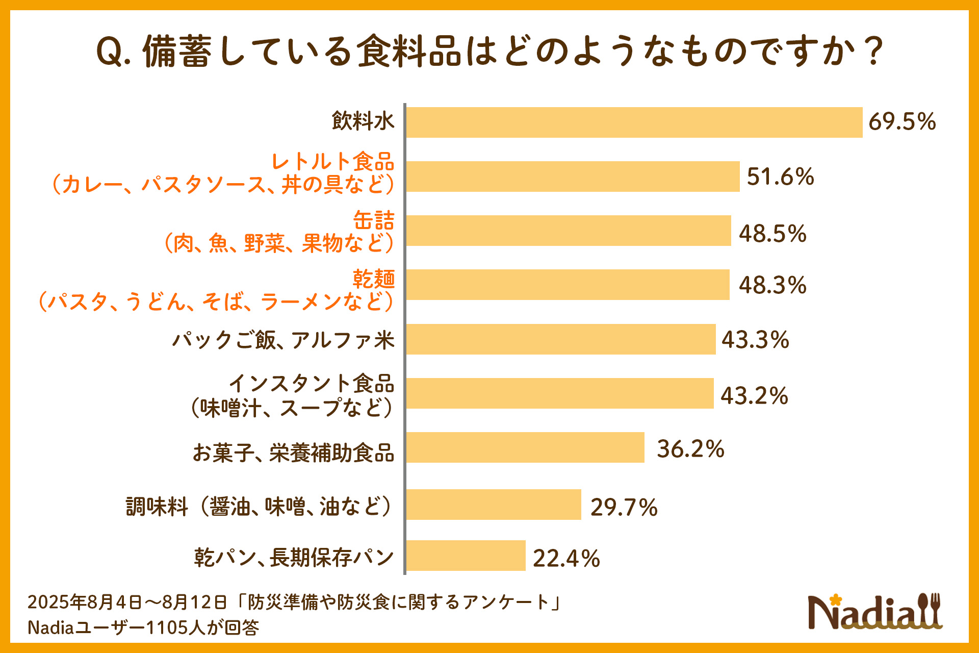また、備蓄している食料品については、飲料水に続き、「レトルト食品」「缶詰」「乾麺」が上位を占めました。これらは長期保存が可能であり、いざという時に役立つ食品として選ばれていることが分かります。