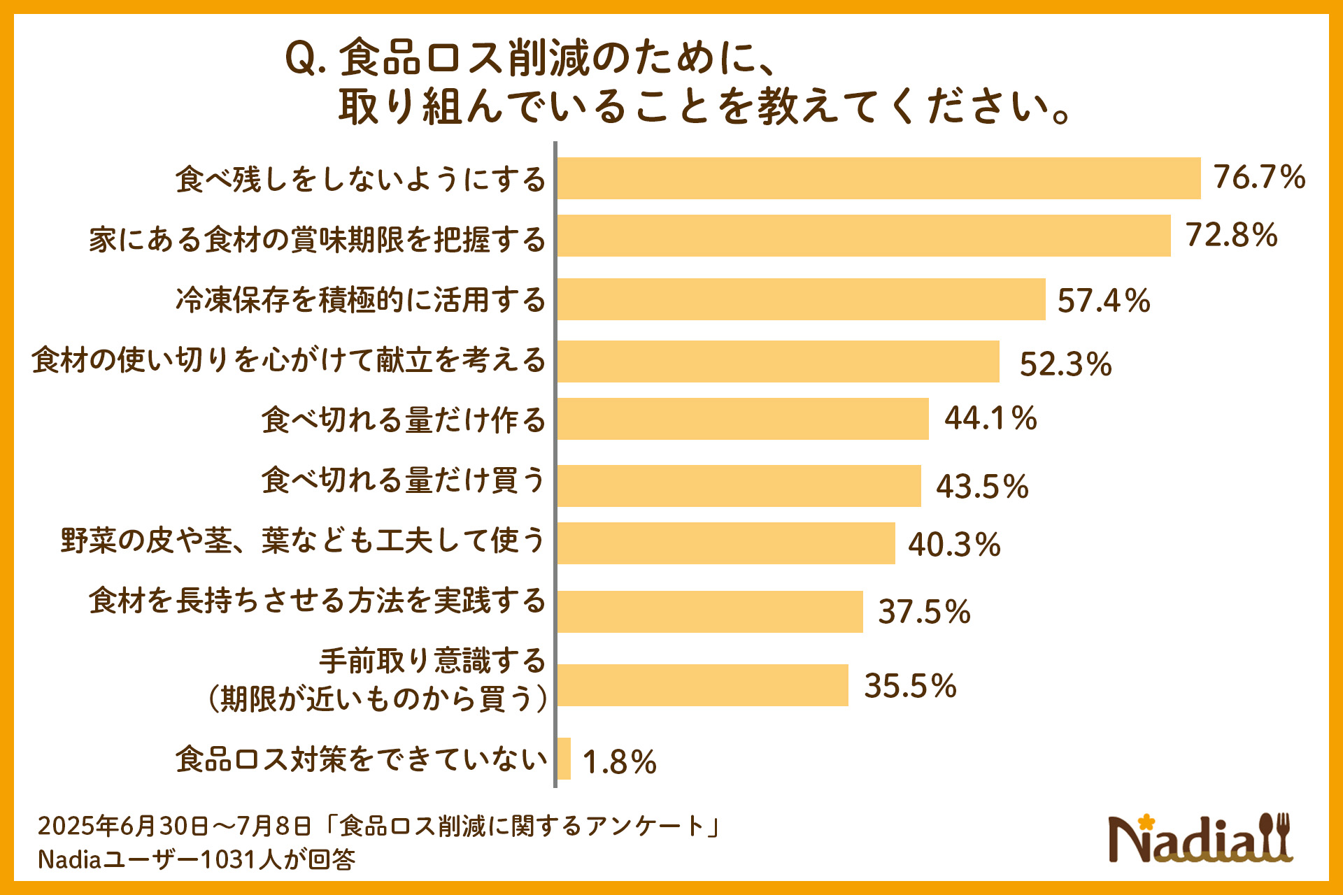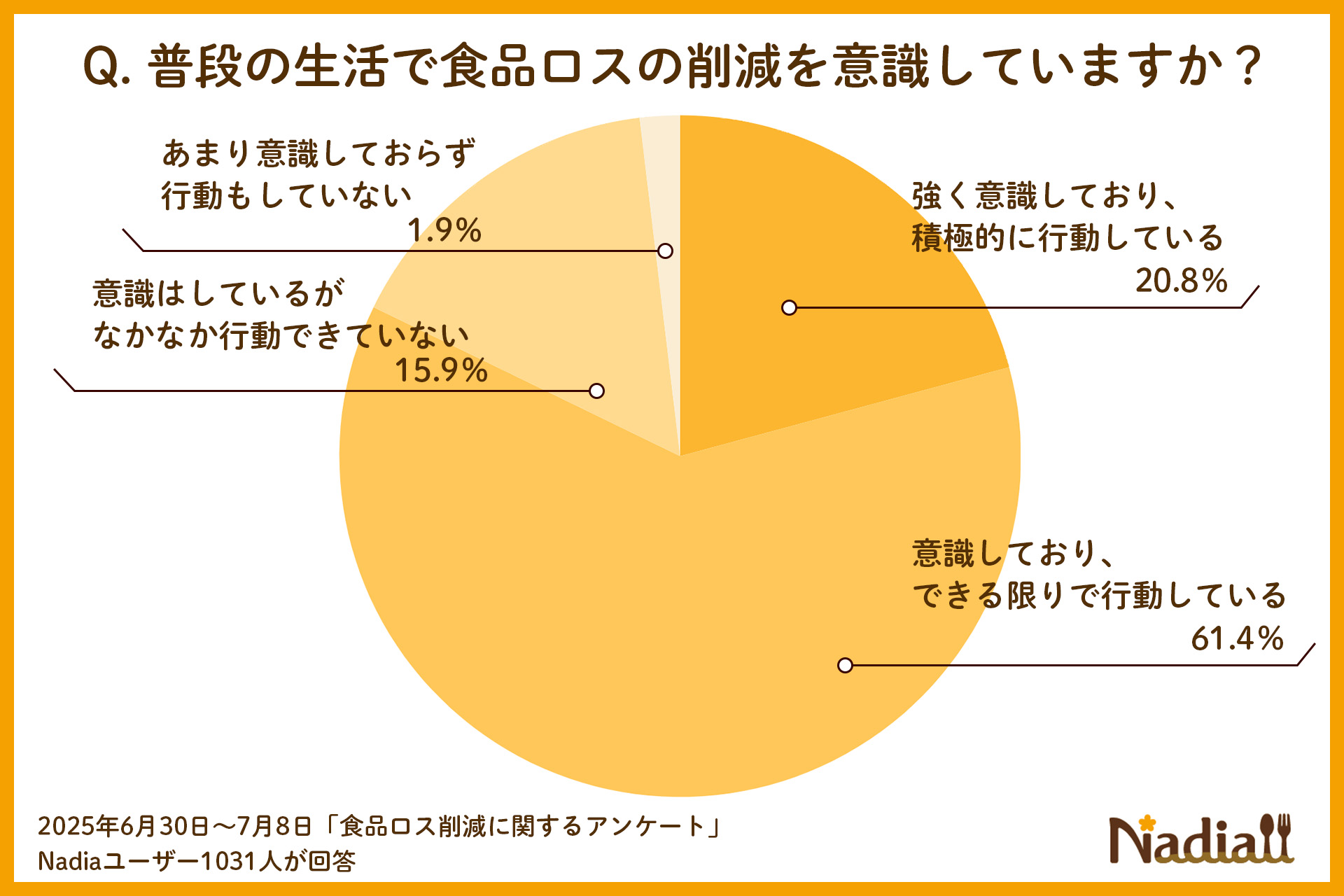 10月は「食品ロス削減月間」、10月30日は「食品ロス削減の日」です。日本の食品ロスは年間約464万トン(令和5年度)にのぼり、このうち約半数にあたる233万トンが家庭から発生していると推計されています(※1)。そこで、Nadiaで食ロス削減に関するユーザーアンケート(※2)を実施したところ、普段から食品ロス削減を「強く意識しており、積極的に行動している」「意識しており、できる限りで行動している」と回答した人は合わせて82.2%にのぼりました。