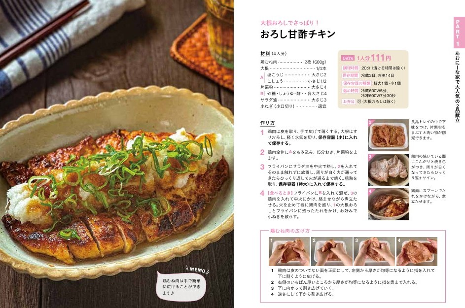 写真付きで細かく丁寧に解説されたレシピは、料理初心者でも作りやすい工夫がたくさん。さらに、1人分の金額・保存期間・温め時間まで細かく丁寧に記載されているので、作り置きを初めてするという方でも安心です。