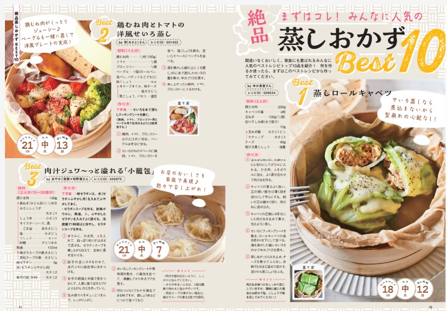 朝昼晩のご飯も、おやつも、なんでも作れる「せいろ蒸し」。ほったらかしで簡単なだけでなく、うま味がぎゅっと凝縮されて、絶品おかずができあがります。そんな魅力たっぷりの「せいろ」をとことん楽しめる一冊です。ぜひ手に取ってみてください。