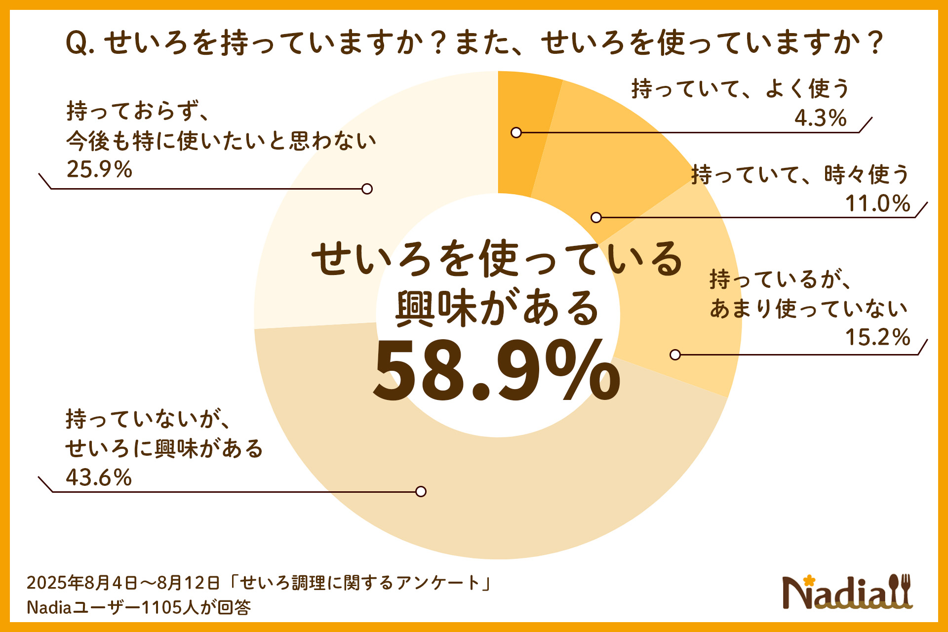 そこでNadiaユーザーへ「せいろ調理」に関するアンケート調査(※)を実施したところ、「せいろを使っている」「せいろを持っていないが、興味がある」人を合わせると58.9%という結果に。半数以上の方がせいろに関心を持っていることがわかりました。