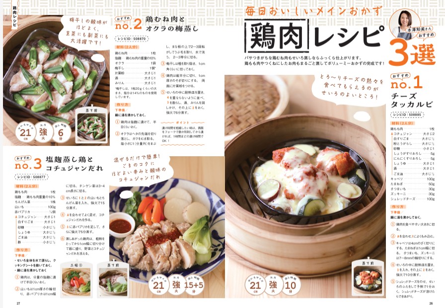 鶏肉、豚肉、魚、野菜と、多彩なラインナップのおかずがそろっています。食材別に分かれているので、その日に冷蔵庫にあるものや、作りたいものをパッと選べるのが魅力。どんな食材も、ふっくらしっとりと仕上がり、美味しくなります。