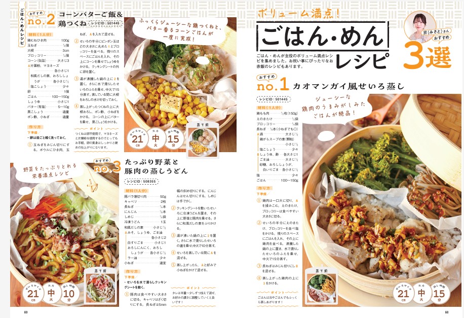 ご飯や麺を主役にしたレシピは、忙しくて時間がないときにおすすめです。蒸しラーメンやビビンバ、カオマンガイ風ご飯など、ひと皿で満足できるレシピが満載。ご飯とおかずをまとめて同時調理する方法も紹介されています。