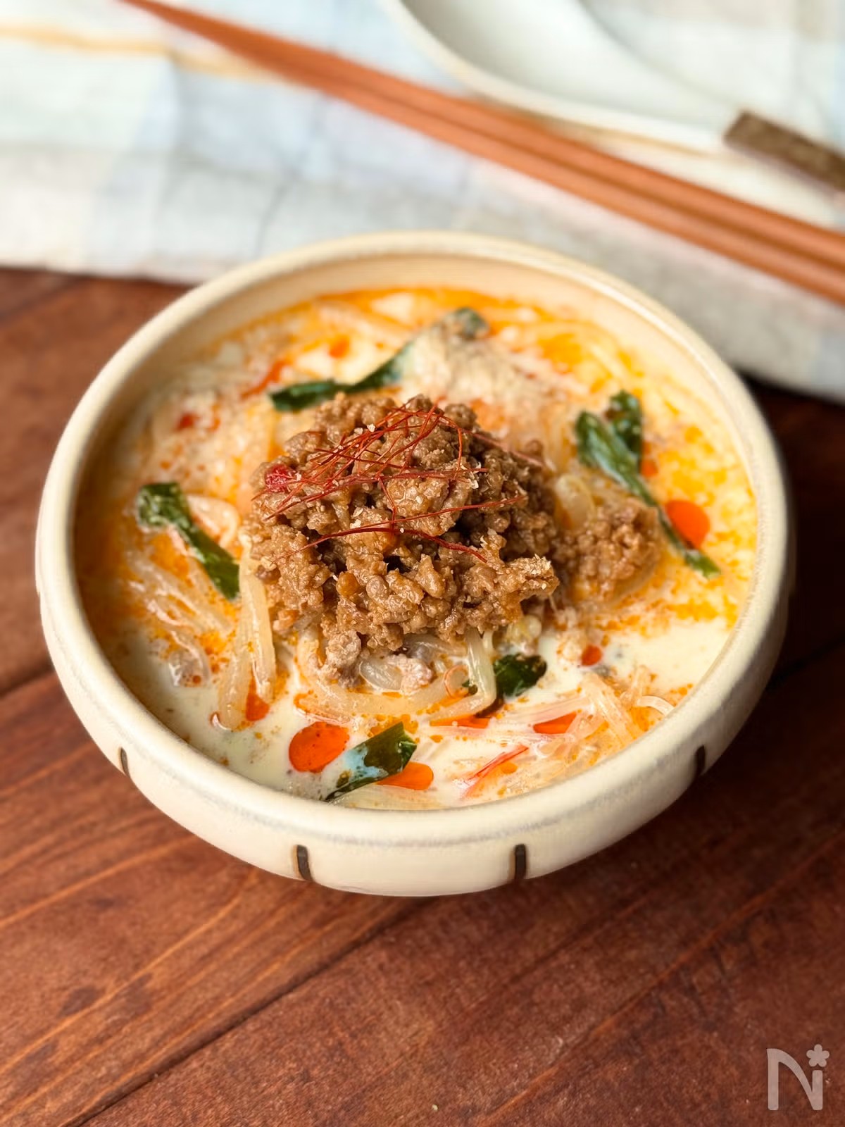 Instagramで人気1位の、春雨を使った担々麺風スープです。ヘルシーだけど食べごたえばっちりで、ダイエット中の方にもおすすめ。うま味たっぷりの肉味噌とすりごまが、美味しさの秘訣。辛さは豆板醤(トウバンジャン)の量で調整可能です。