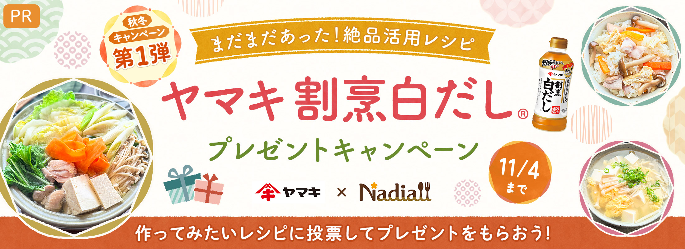 Nadia株式会社(東京都港区/代表取締役社長 葛城嘉紀 以下「Nadia」)とヤマキ株式会社(愛媛県伊予市/代表取締役社長 城戸 善浩 以下「ヤマキ」)がタイアップし、「ヤマキ 割烹白だし®」の認知・消費拡大を目的に、レシピ投票キャンペーンを実施いたします。