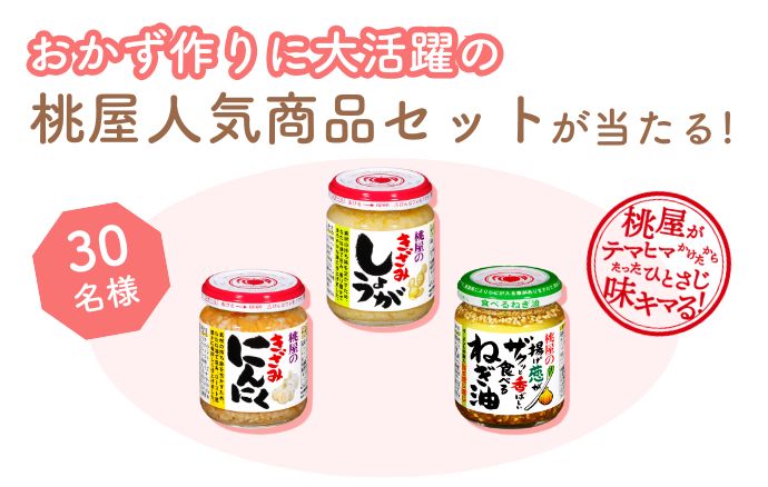 今回は、桃屋の人気商品3点セット(「きざみにんにく」「きざみしょうが」「食べるねぎ油」)を、抽選で30名様にプレゼント!