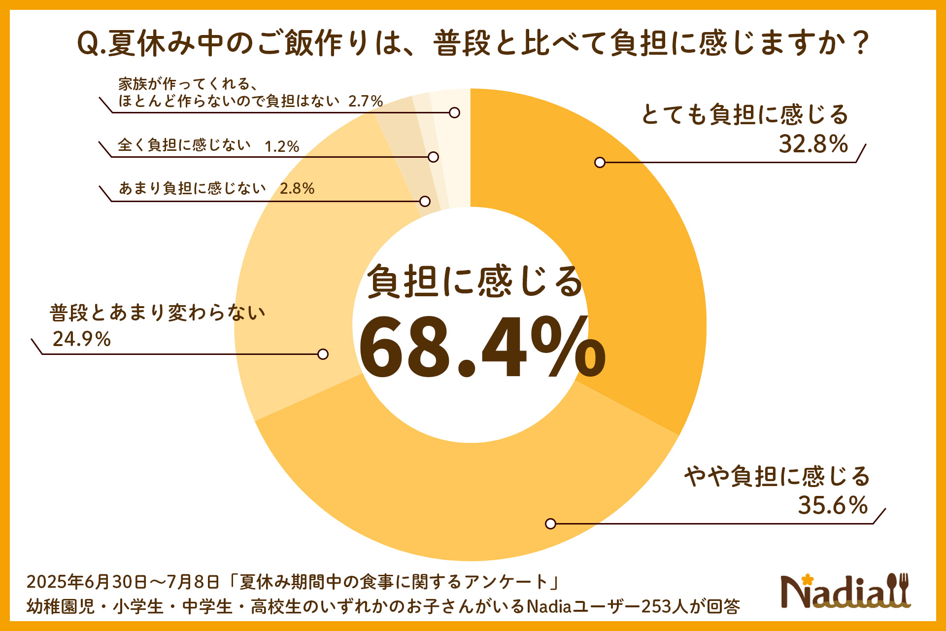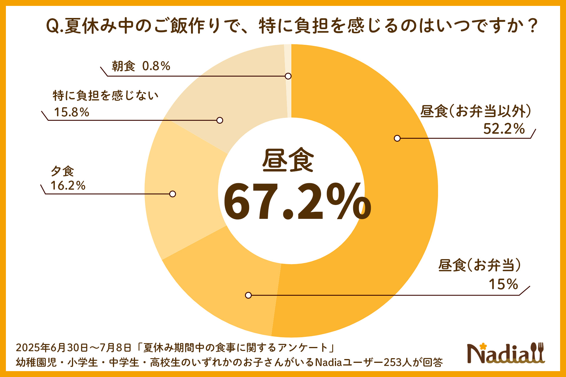 Nadiaで幼稚園児から高校生までのお子さんがいるユーザーに「夏休み期間中の食事」に関するアンケートを実施したところ、夏休み中のご飯作りが普段よりも「とても負担に感じる」「やや負担に感じる」と回答した人は合わせて68.4%という結果に。さらに、夏休み中のご飯作りで特に負担を感じるのが「昼食(お弁当以外)」「昼食(お弁当)」であると回答した人は合わせて67.2%という結果になりました。